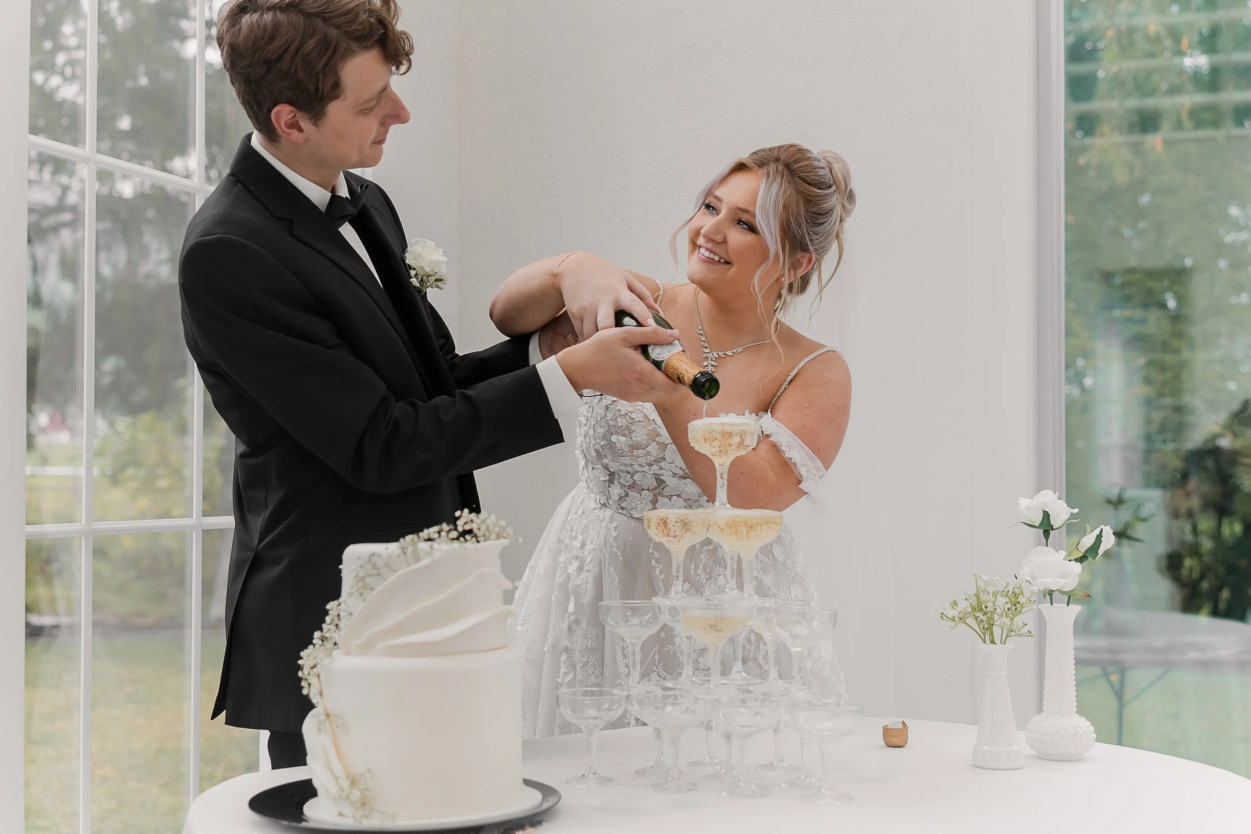 The reception followed the same luxurious theme, with tables draped in crisp white linens, contrasted by black hand bow napkins and sleek gold flatware, creating a stunning monochromatic palette. Tall, elegant taper candles in black holders added warmth and sophistication to the tables, while fresh greenery ran along the center, tying together the natural and elegant aesthetic. Towering white floral centerpieces on black stands drew attention to the height of the space, providing a grand yet serene atmosphere. The light-filled room, with large windows framing the greenery outside, was the perfect setting to complement the soft, romantic elegance of the décor, evoking a sense of old-world charm and modern sophistication. This shoot was a dream. Every detail came together perfectly.